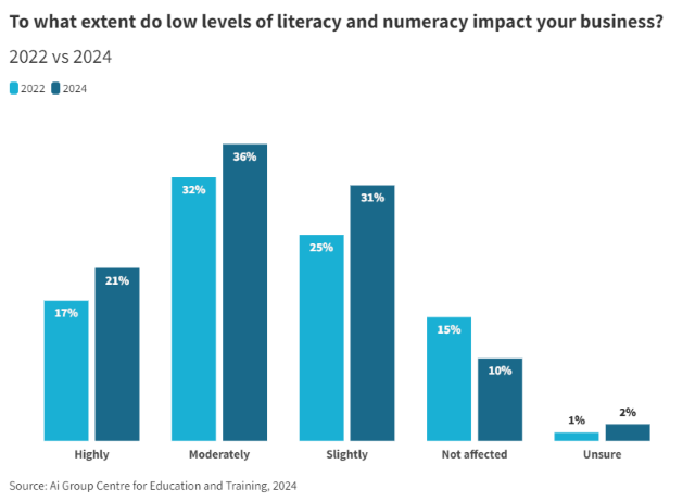 Low levels of literacy and numeracy are having a more pronounced effect on productivity in the workplace than reported in the Centre’s survey in 2022.